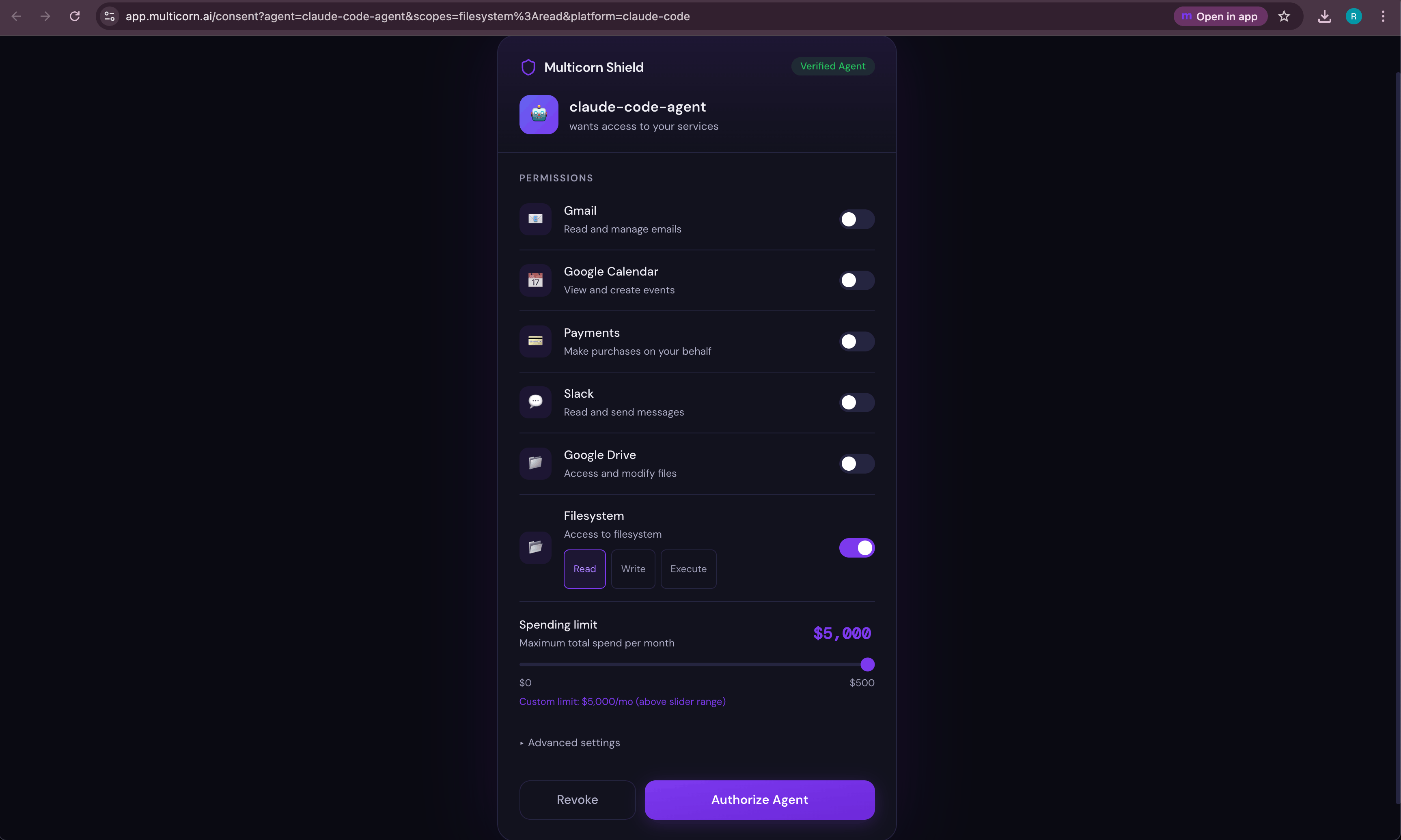 The consent screen is the difference that matters most for non-technical users. When an agent requests new permissions, a visual consent screen opens in the browser. The user sees exactly what the agent is asking for, toggles permissions on or off, and authorises or denies. No YAML files, no CLI prompts, no Slack threads.