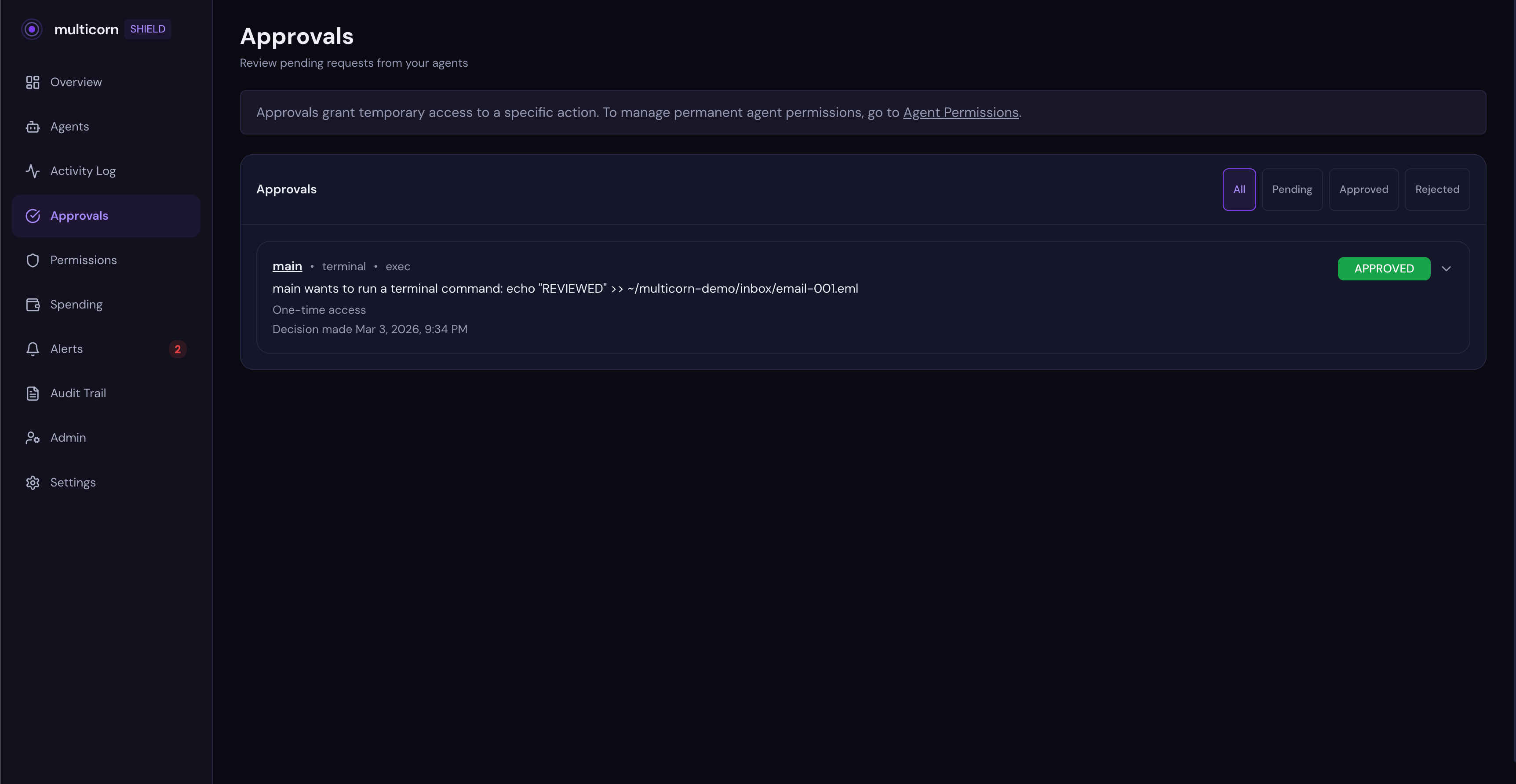 Here's what a completed approval looks like. This one was approved with "This action only", so the agent got one-shot access and will need to ask again next time: