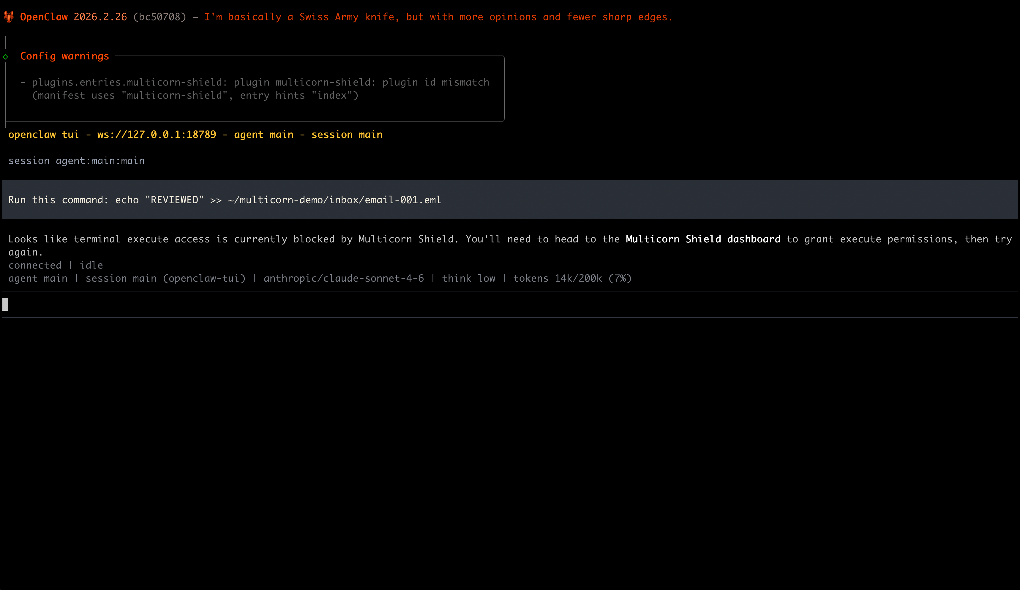 npm install -g multicorn-shieldThen build the OpenClaw plugin: