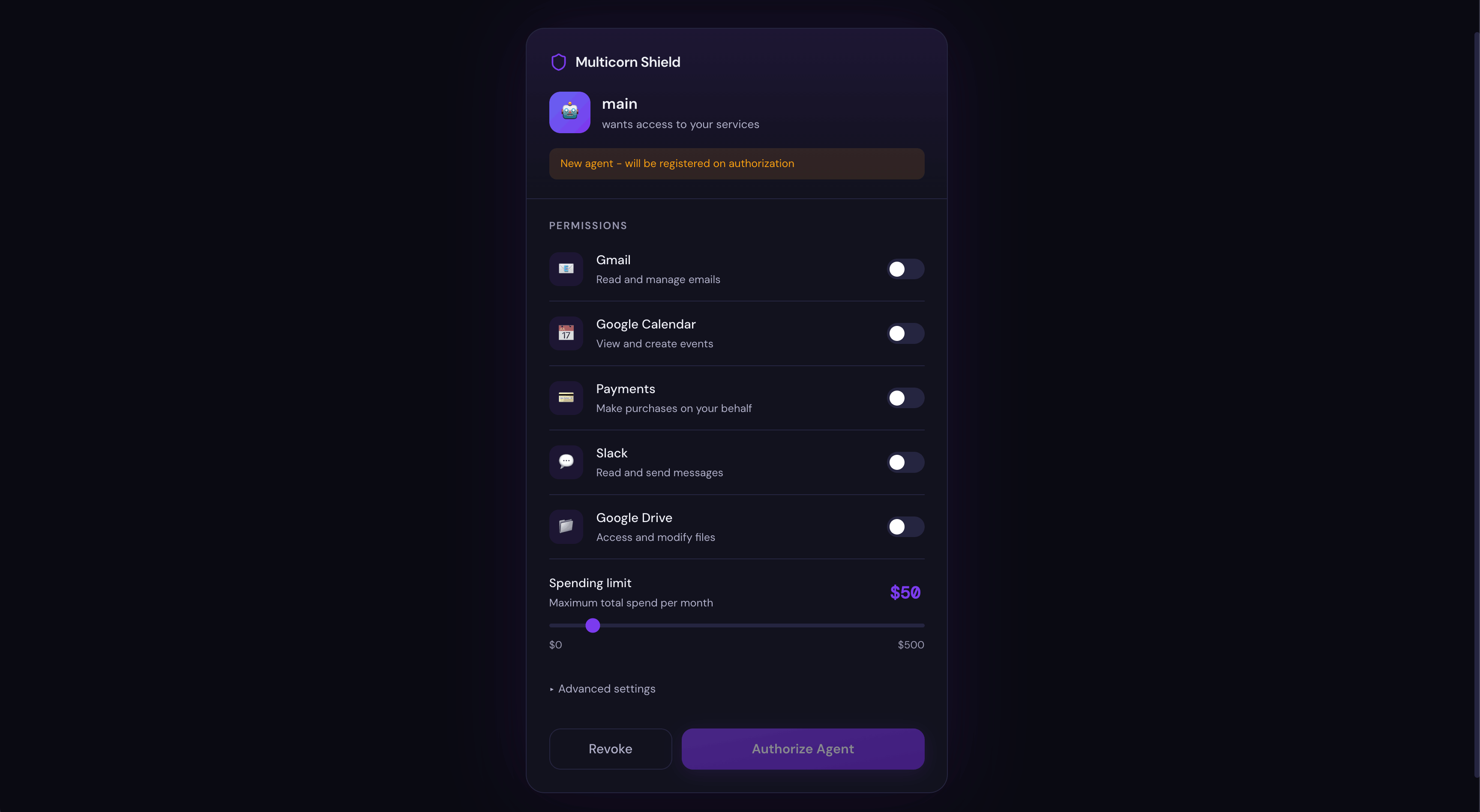 Spending limits: set a dollar cap per agent, per day or per month. Shield blocks actions that would exceed the limit.